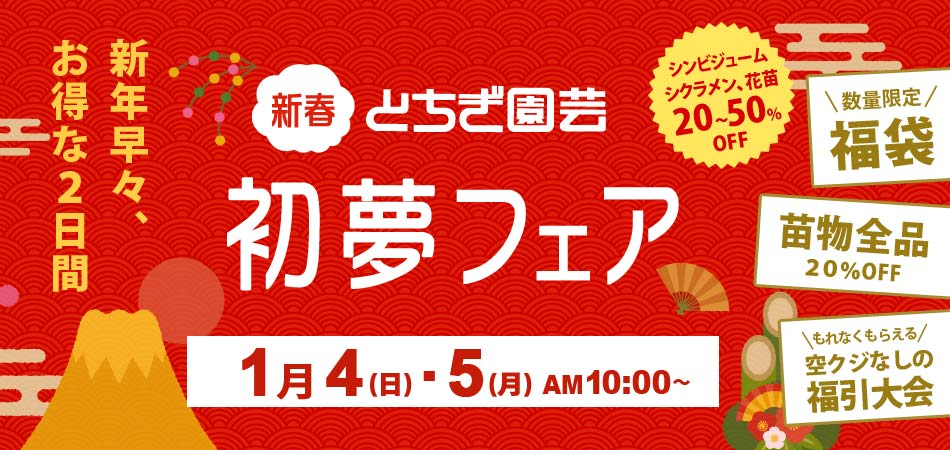 2026年1月4日(日)・5日(月)10時~、初夢フェアを開催いたします! 〇シクラメン、シンビジウム20~30%OFF☆ 〇苗全品20%~OFF☆ 〇福販売袋(数量限定)☆ 〇空クジなしの福引大会もあります♪♪ 202……